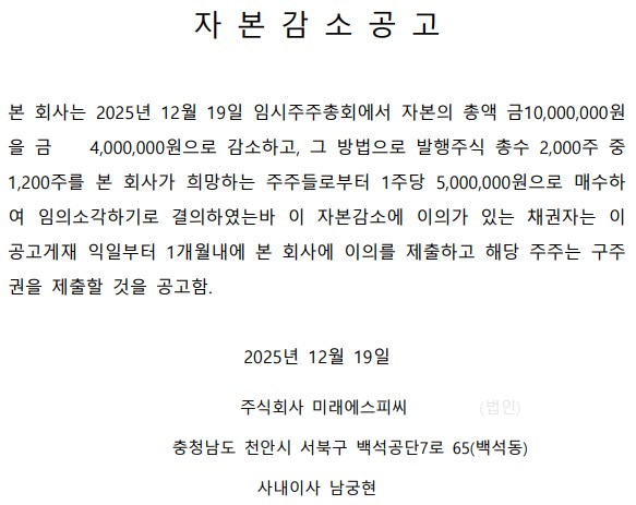 | [미래SPC] 자본감소 공고 | 2025-12-19 | |